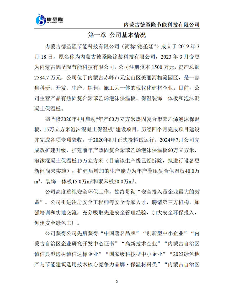 內(nèi)蒙古德圣隆節(jié)能科技有限公司成立于2019年,位于內(nèi)蒙古赤峰市元寶山區(qū)美麗河鎮(zhèn)物流園區(qū),是一家集科研、開發(fā)、生產(chǎn)、銷售、施工為一體的現(xiàn)代化建材企業(yè)。公司主營產(chǎn)品:熱固復合聚苯乙烯泡沫保溫板、保溫裝飾一體板和泡沫混凝土保溫板,年生產(chǎn)能力達到6000000平方米。
